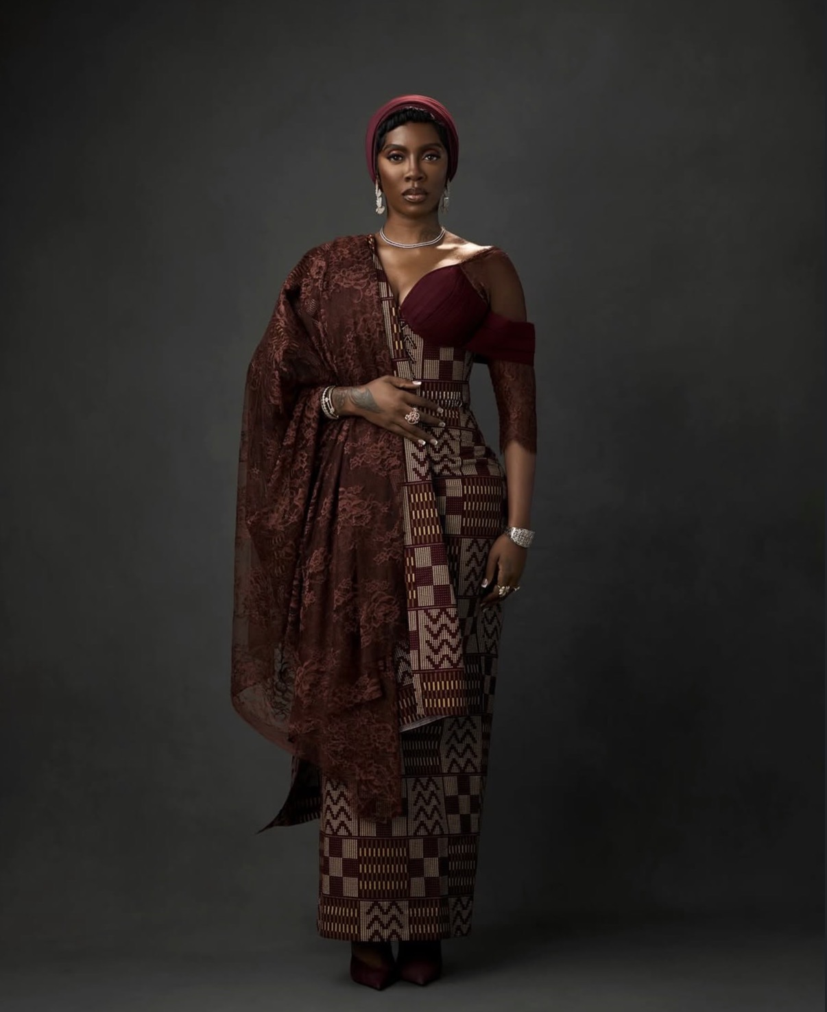 For the launch of her music foundation, Tiwa Savage delivered a regal moment in a rich burgundy traditional ensemble that leaned into heritage with refined elegance. The interplay of patterned textiles and lace elements created depth, allowing the look to feel layered without losing clarity.