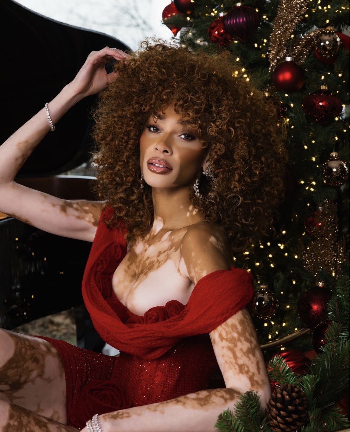 Winnie Harlow delivered one of the clearest expressions of celebrity Christmas glam, embracing a look created specifically for the season. Her complexion appeared softly perfected, with foundation and concealer evening the skin while allowing her vitiligo to remain beautifully visible. Light-reflecting shimmer swept across the eyes, adding warmth without overpowering the gaze. Meanwhile, carefully shaped brows framed long, fluttering lashes that introduced depth and movement. On the lips, a nude gloss grounded the look, echoing her signature aesthetic while harmonizing seamlessly with the festive red styling and holiday backdrop.