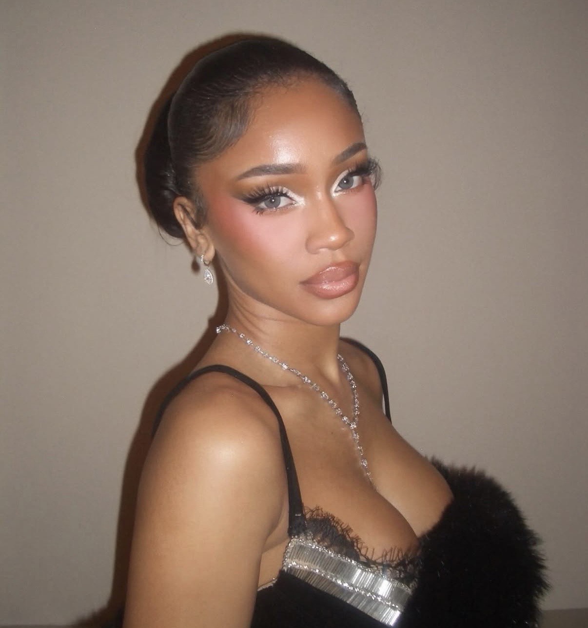 Elsewhere, Saweetie leaned into winter fantasy, offering a high-glam moment that aligned effortlessly with the season’s indulgent tone. Her eyes took center stage, defined by dramatic false lashes and sharply executed winged liner. Neutral shadows layered with shimmer washed over the lids, while warmer, rosy hues softened the crease and lower lash line. Finished with glossy neutral lips outlined in brown liner, the look fit squarely into the ongoing conversation around celebrity Christmas glam, even without explicit holiday cues.