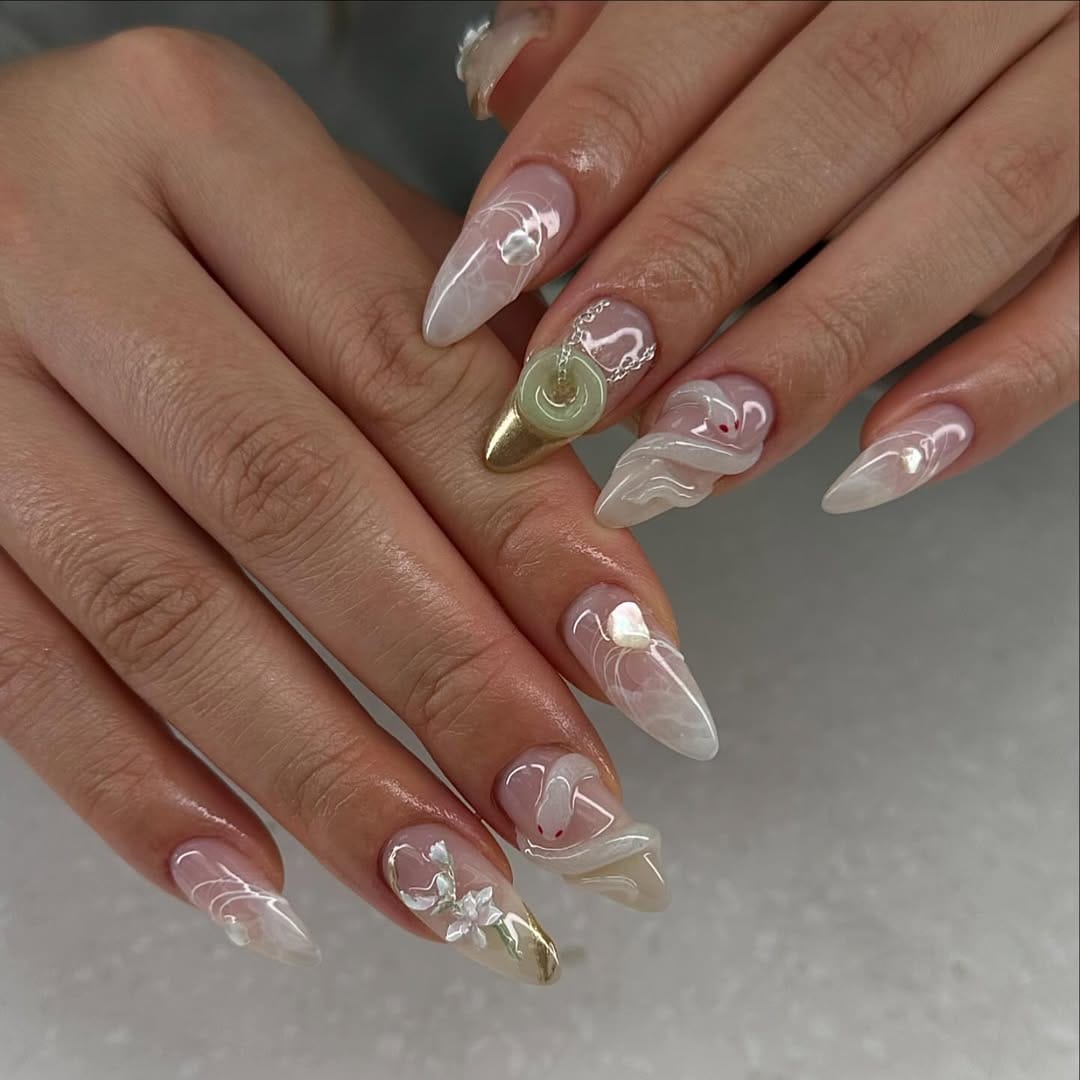 We’re talking fairy dust meets futuristic glam. Holographic glazed nails bring a pearlescent sheen that shifts beautifully in the light, giving off an almost otherworldly glow. A sheer base layered with iridescent chrome powder creates that glazed-donut effect—mesmerizing, elegant, and low-key magical. Perfect for May, these nails strike the ideal balance between ethereal and wearable, effortlessly complementing every outfit.