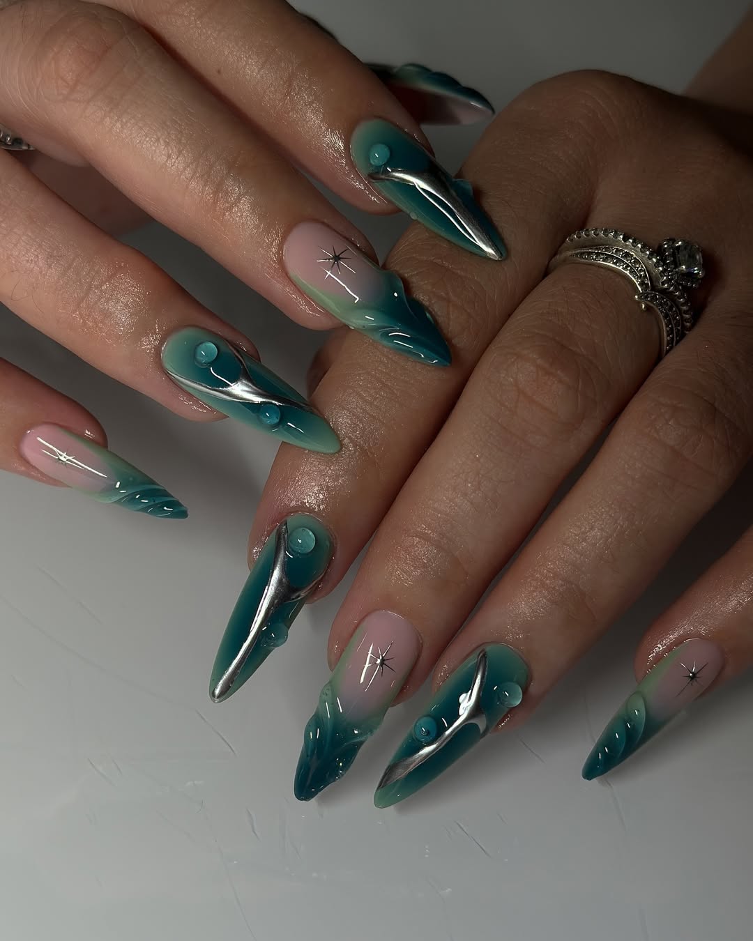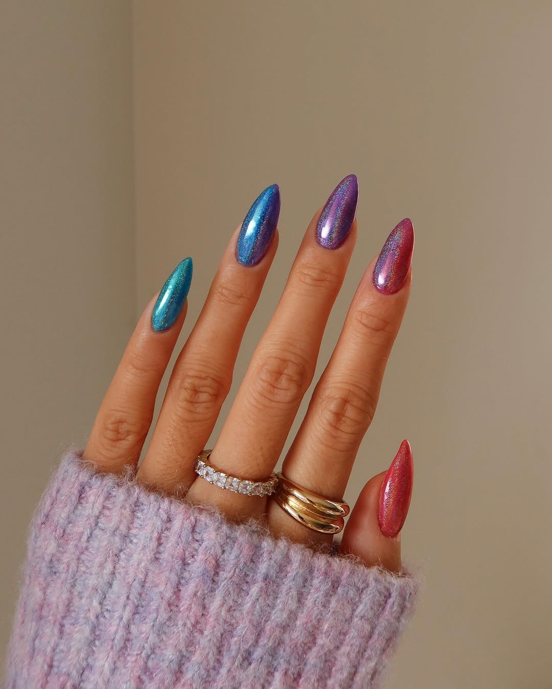 High-shine, mirror-finish nails are still very much having their moment—and honestly, they’re not going anywhere. The liquid metal effect delivers a futuristic, almost sci-fi allure that instantly elevates your look. Whether you opt for classic silver, dreamy rose gold, or a moody sapphire chrome, these nails radiate main character energy. Pair them with stacked rings, and just like that, your hands are the headline.