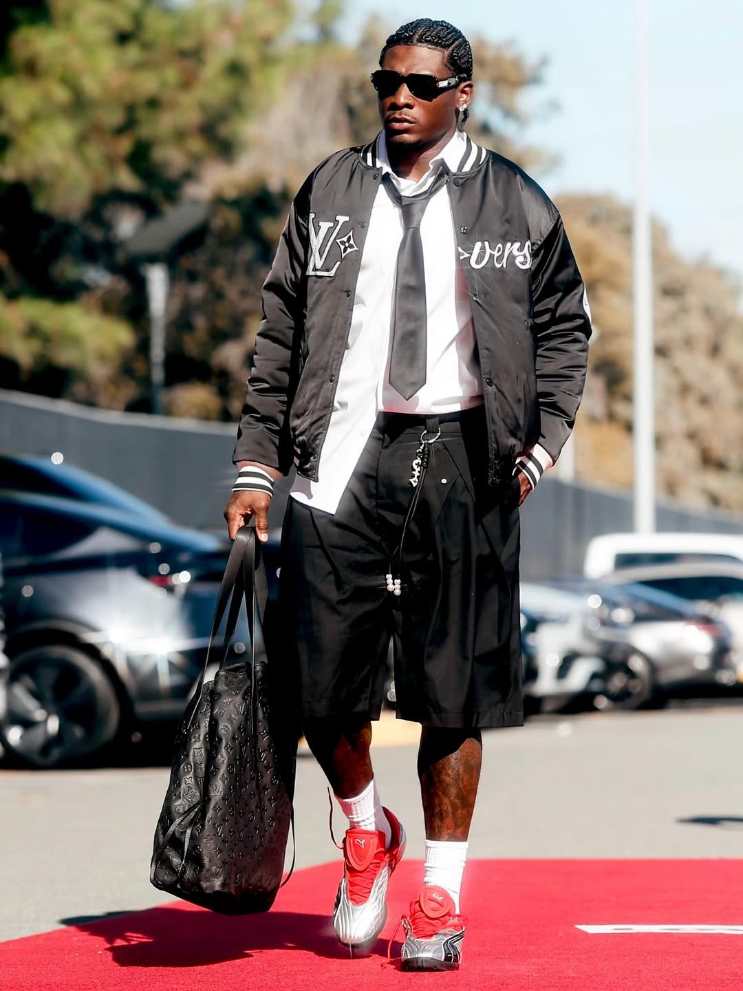 At the launch of the Sacai x Ugg second collaboration, NFL star Stefon Diggs delivered a rugged-meets-luxury moment. His caramel-toned Carhartt leather jacket, trimmed with a contrasting black collar, sat effortlessly over brown cargo pants, a subtle nod to utilitarian roots. Then came the twist. A silver chain belt caught the light, adding edge, while the avant-garde Ugg x Sacai Thigh-High Boot in Chestnut pulled the entire look together. The shearling-heavy design brought texture and volume, turning Diggs into a walking embodiment of experimental cool. In the end, it was a flawless marriage of workwear grit and runway-ready innovation. And true to form, it echoed the same confident, daring energy that defines his game-day style.