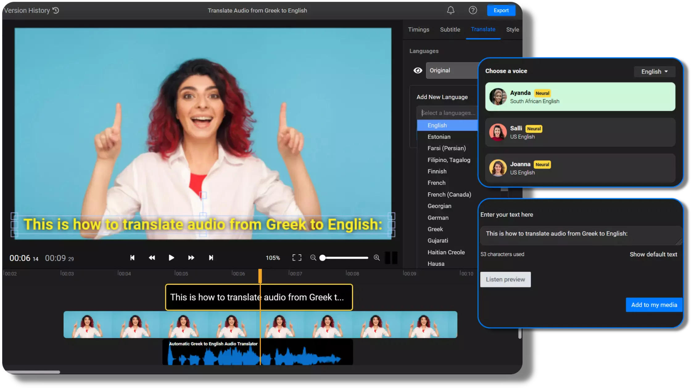 Translating subtitles is simple with Flixier! Select the subtitles in the timeline, then go to the top right corner under the “Translate” tab. Click the “Add New Language” button and choose your preferred language.