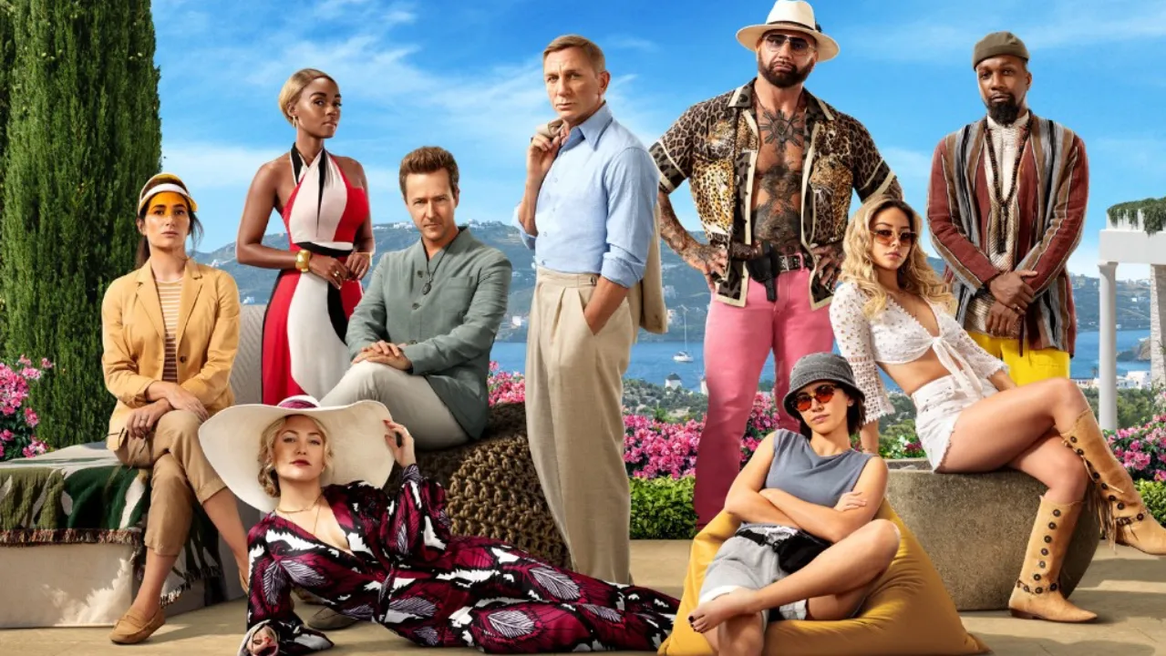 Glass Onion is, without question, the flashiest entry in the trilogy. Set against the sun-drenched excess of a private Greek island, the film leans heavily into spectacle, modern satire, and exaggerated personalities. Benoit Blanc is dropped into a circle of elites who are wealthy, influential, and deeply unserious—a deliberate mirror of tech culture, performative activism, and hollow genius myths.