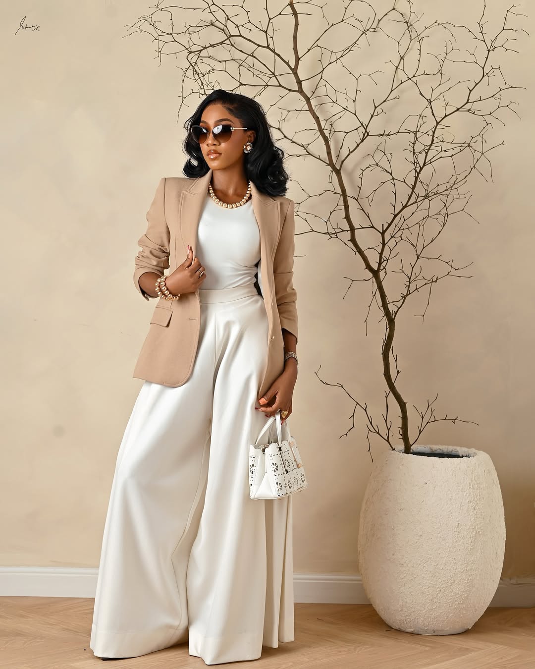 Delicate gold chains, thin hoop earrings, or a single statement ring are great selections for jewelry accessories. Structured totes or sleek crossbody bags in neutral shades are a great addition to the neutral look too. Finally, pointed-toe flats, minimalist sneakers, or ankle boots are superb footwear options.